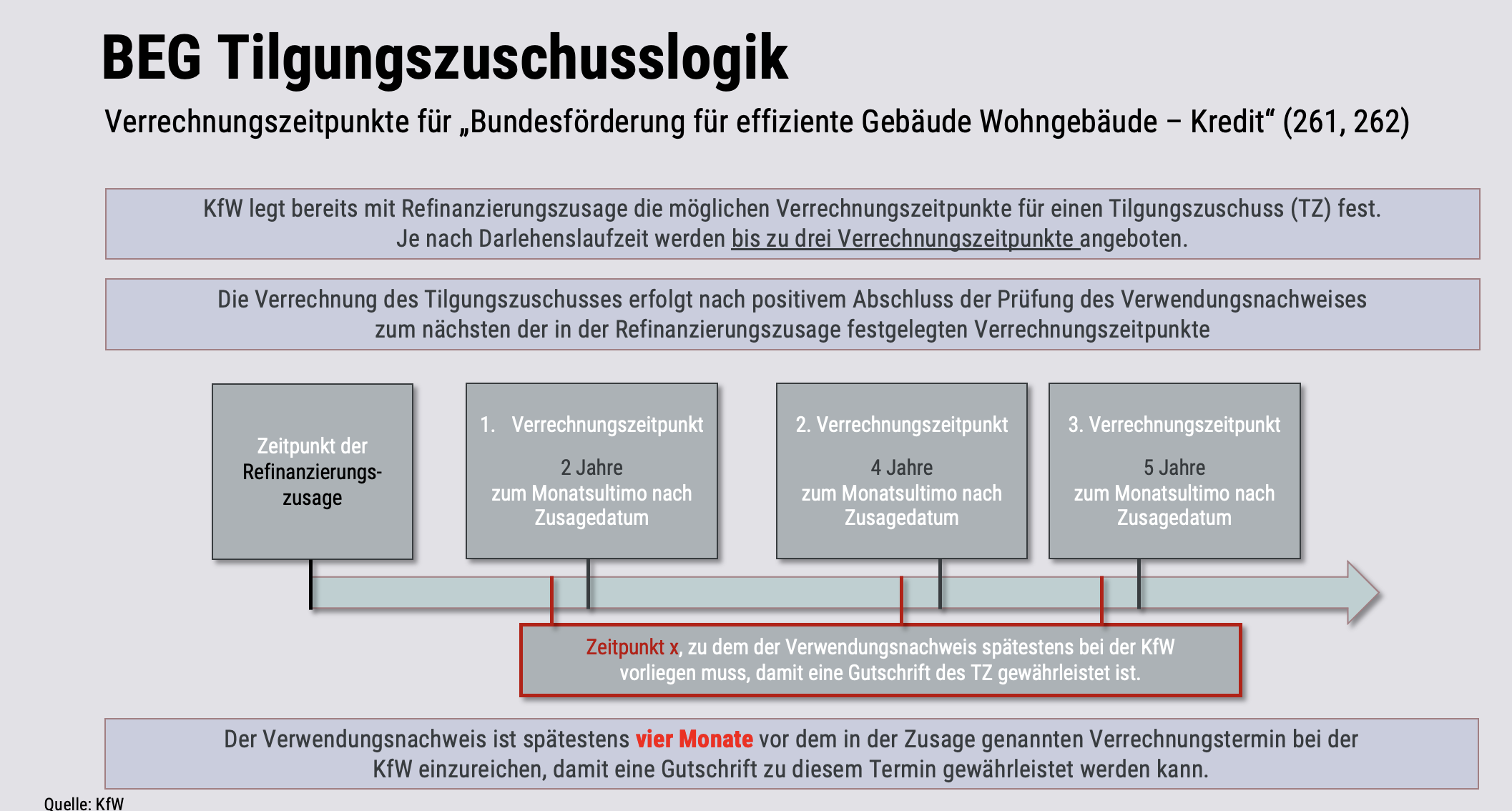 In der zukünftigen BEG-Kreditvariante führt die KfW eine deutlich starrere Regelung zur Verbuchung des Tilgungszuschusses ein: