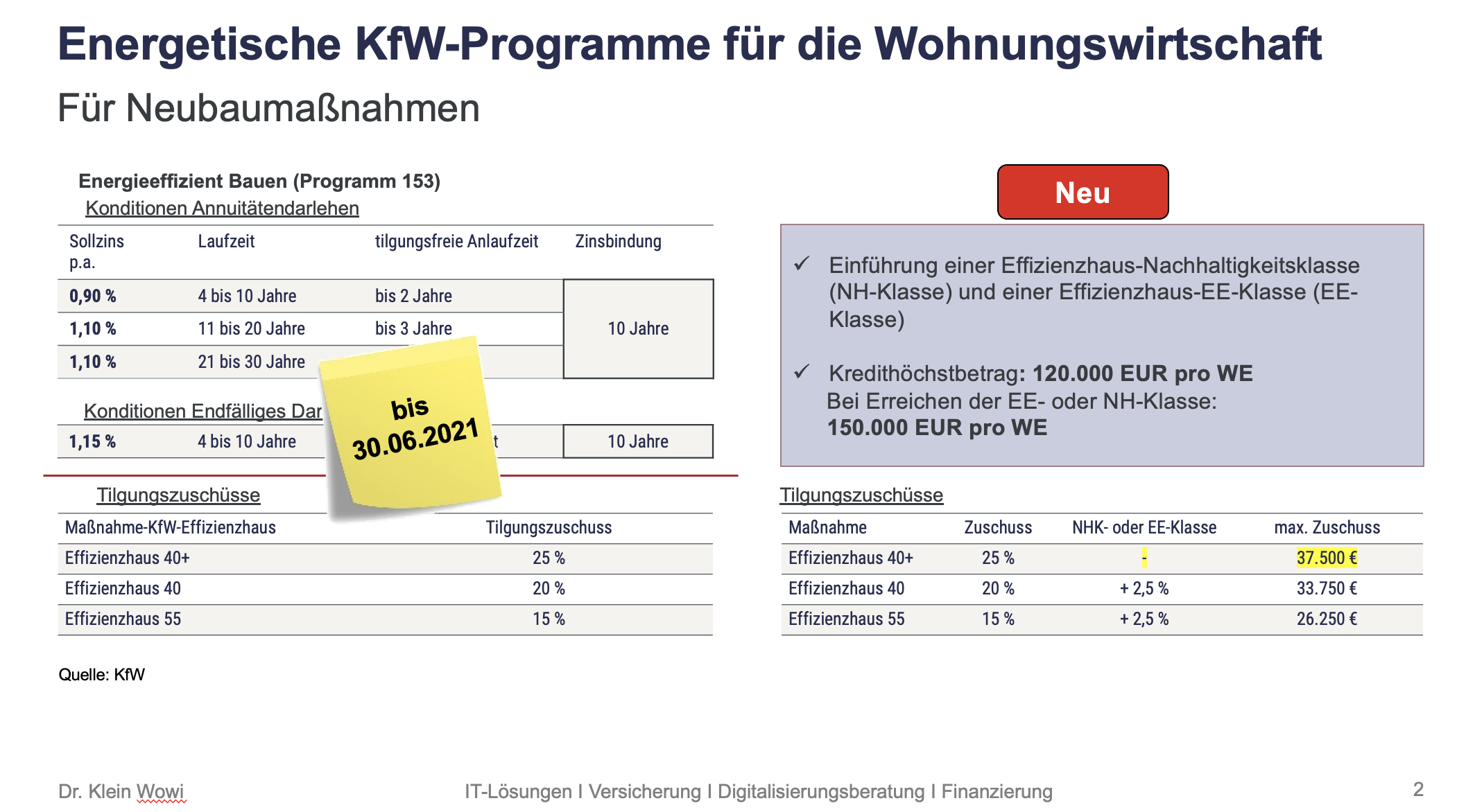 • Die Konditionen für die neue BEG-Kreditvarianten werden voraussichtlich ab dem 30.06.2021 veröffentlicht.
