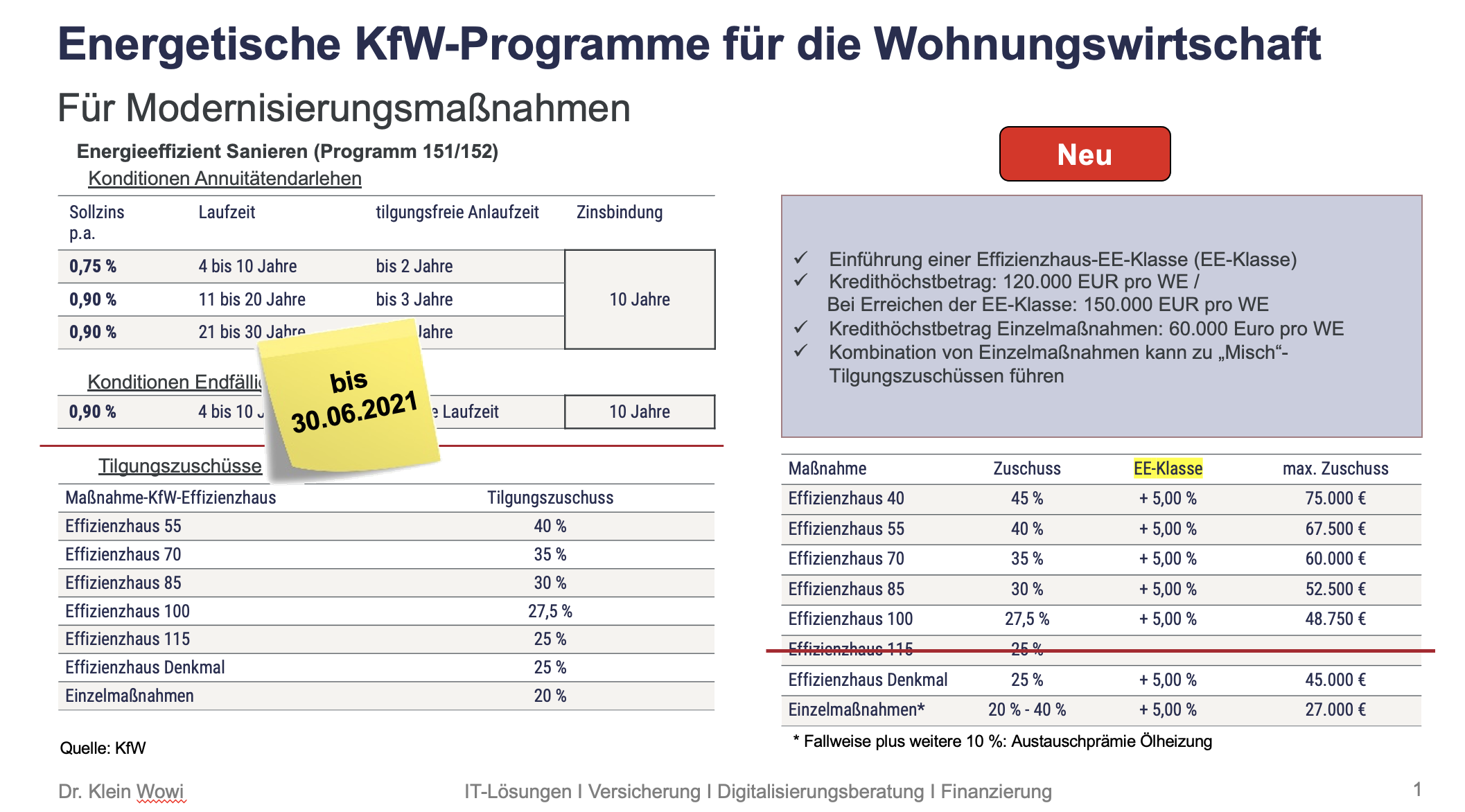 Anpassung: Die Abänderung der Förderbedingungen bei Modernisierungsvorhaben im Vergleich zum Stand März dieses Jahres besteht darin, dass nur noch zusätzlich eine Förderung von 5%-Punkten für die Effizienzhaus-EE-Klasse (EE-Klasse) erreicht werden kann (die zunächst angesetzte Effizienzhaus-Nachhaltigkeitsklasse (NH-Klasse) wurde gestrichen).