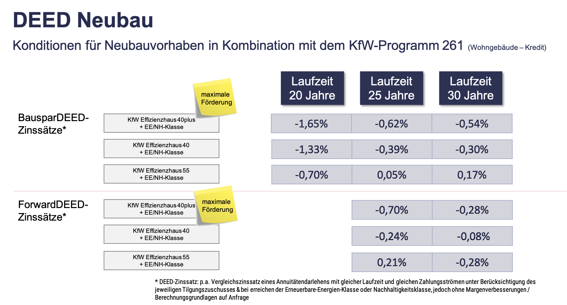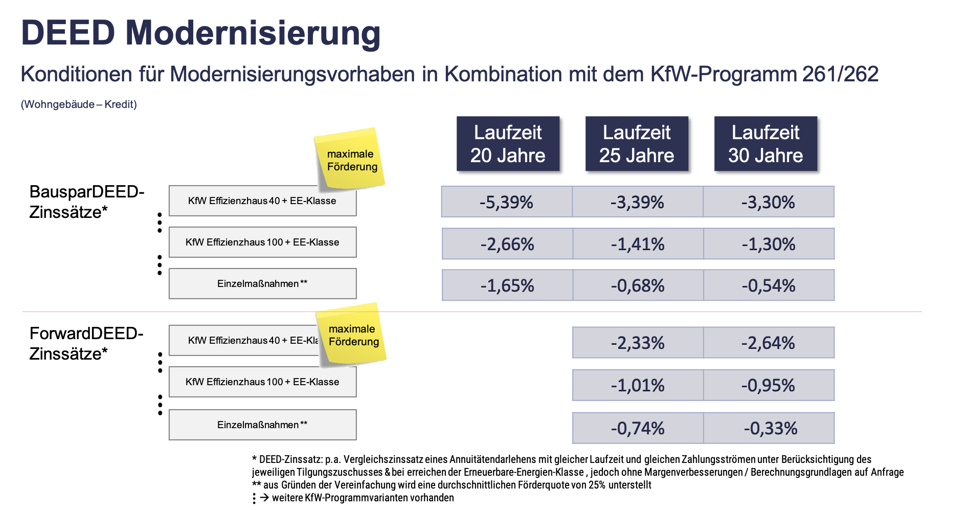 Unter Berücksichtigung der Tilgungszuschüsse ergeben sich weiterhin individuelle Möglichkeiten für eine Umwandlung der KfW-Konditionen in eine sichere Langfristfinanzierung. Sehen Sie hier unsere DEED Kombinationen unter Berücksichtigung der neuen Konditionen seit 01.07.2021:
