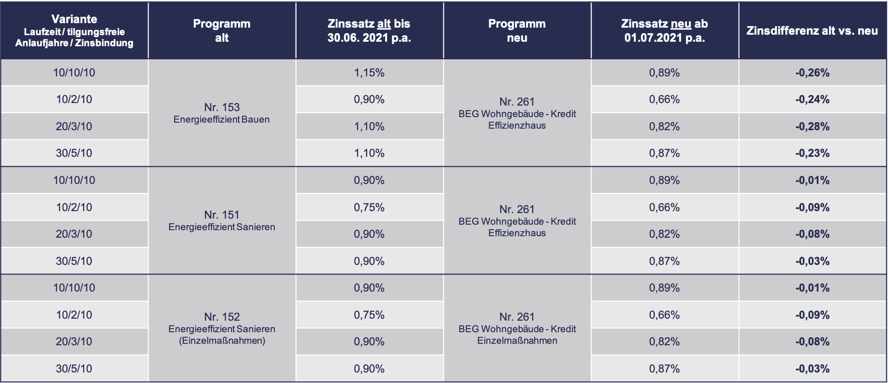 Gegenüberstellung der Konditionen und Programme mit Einführung der Bundesförderung für effiziente Gebäude (BEG) zum 01.07.2021
