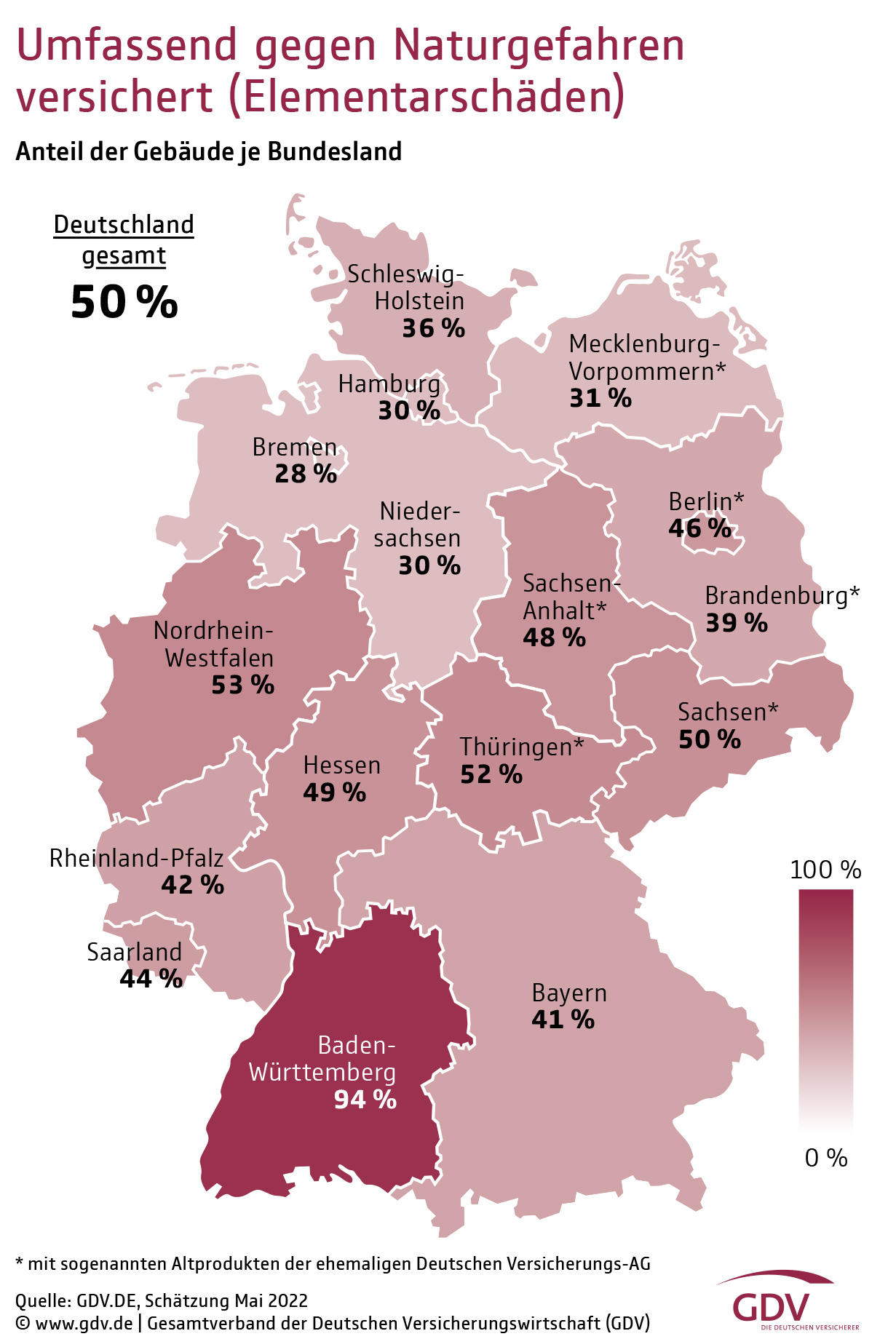 Bundesweit hat sich die Akzeptanz zur freiwilligen Versicherung gegen erweiterte Elementarschadenereignisse in den vergangenen Jahren erhöht. Gerade nach den Unwetterereignissen im Sommer 2021 ist die Versicherungsquote in Deutschland um 4 Prozent auf jetzt 50 Prozent gestiegen. Auf Länderebene liegen die Versicherungsquoten jedoch noch stark auseinander. Im Norden Deutschlands ist die Akzeptanz für den Versicherungsschutz wenig ausgeprägt. Von Nordrhein-Westfalen über Hessen, Thüringen, Sachsen-Anhalt bis nach Sachsen bildet sich in der Mitte Deutschlands ein Band mit konstanten Mittelwerten von 48 bis 53 Prozent Durchdringungsquote. Die unangefochtenen Fans der erweiterten Elementarschadenversicherung finden sich in Baden-Württemberg. Dort sind mit 94 Prozent fast alle Gebäude gegen entsprechende Schadenereignisse versichert. Diese ungewöhnlich hohe Zahl resultiert noch aus den Zeiten der Pflichtversicherung, die dort bis in die 1990er Jahre bestand.